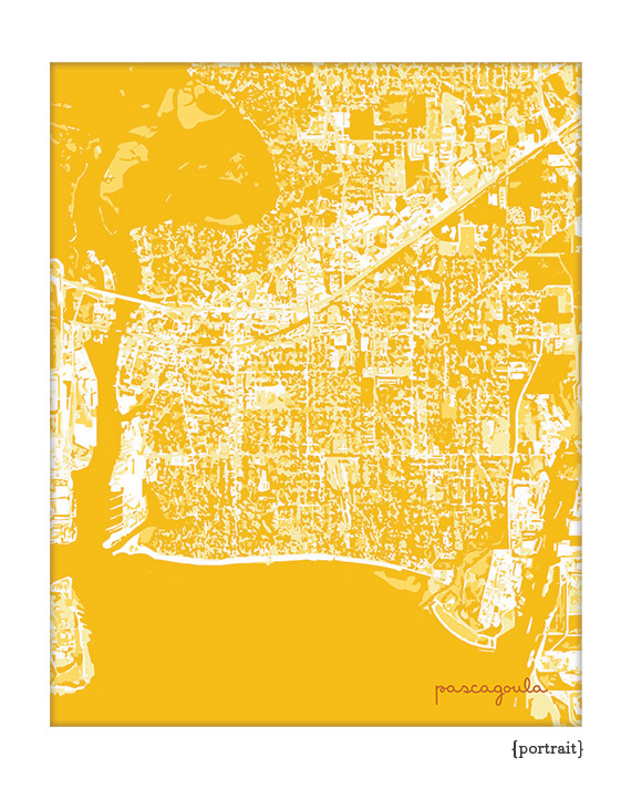 Capture your favorite coastal Mississippi city on paper with this aerial map print of Pascagoula! Choose your color scheme to match your decor. Display it alone or in a unique travel collection of your favorite places.